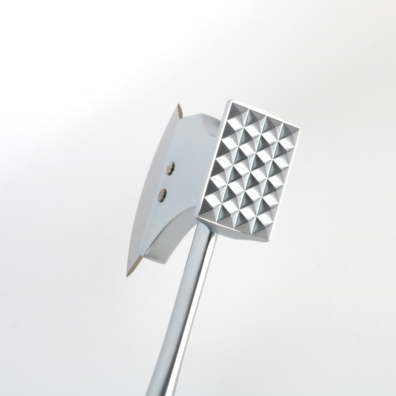 Az új tervezésű, cinkötvözetből készült hús puhítóként és pizzavágóként is használható többfunkciós eszköz 25 cm hosszú. Az elülső vége két funkcionális felületre oszlik: az egyik a húspuhító, a másik pedig a pizzavágó számára. A nyél optimalizált ív alakú, a markolat melletti rész pedig a markolat melletti része is vastagabb műanyagból készült, az egyik kézi tartás érdekében a felnőttek számára is vastagabb. a fogantyú farkához, hogy csökkentse a tenyérfájdalmat és növelje a kényelmet hosszabb használat során.