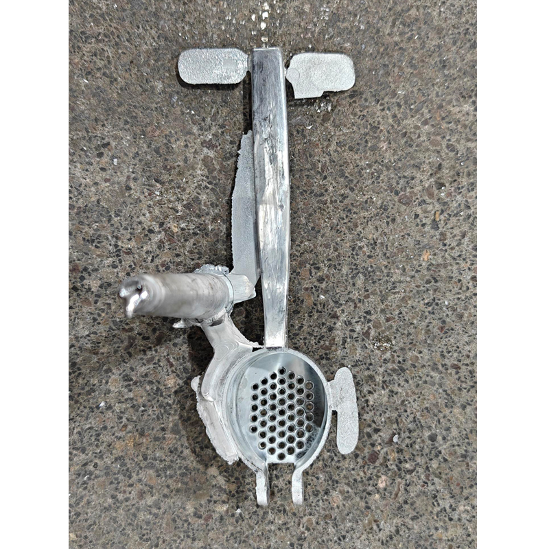 Az 1. kép a fokhagymaprés durva öntési állapotát mutatja. Durva megmunkálást követően manuálisan polírozzák. A 3. képen az alkatrész látható, miután egy 180 fokos, magas hőmérsékletű galvanizáló automata gyártósoron keresztül kezelték. Végül a minősített alkatrészeket összeszerelik.