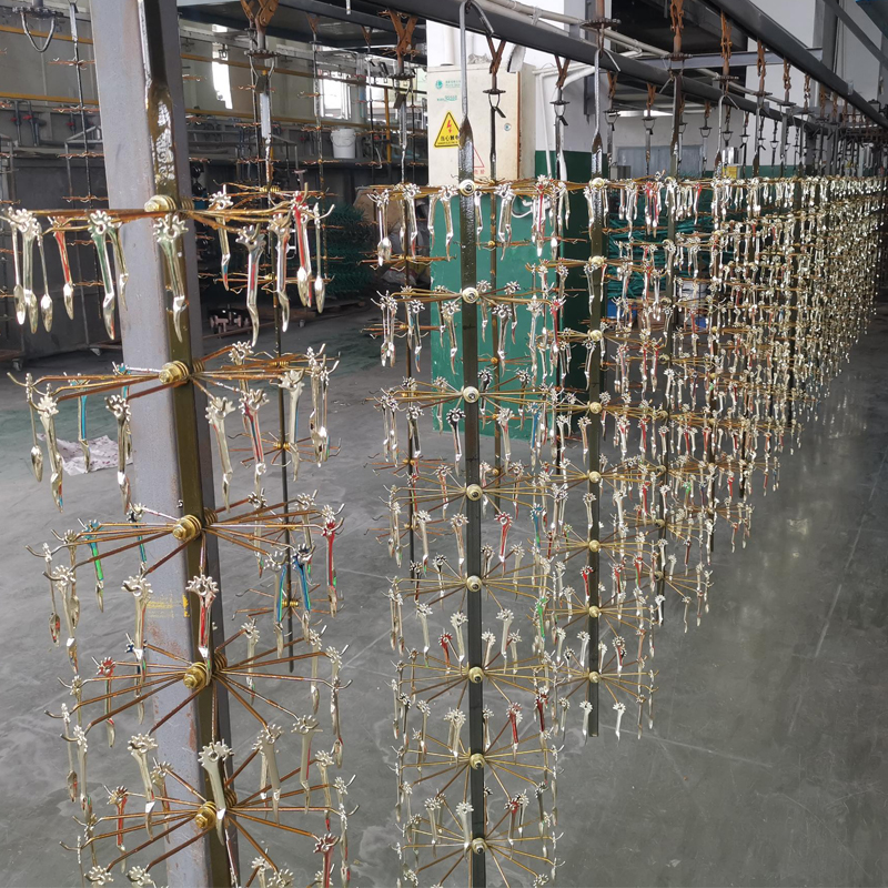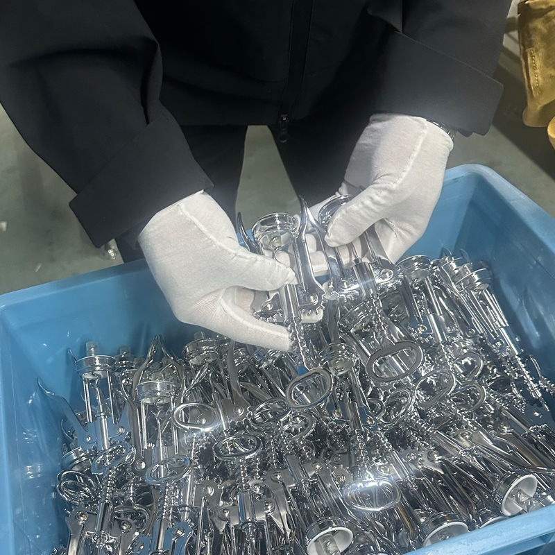A dugóhúzó összes alkatrészének bevonatai jellemzően galvanizálási vagy festési módszereket alkalmaznak, ezen az ábrán a galvanizálásra koncentrálunk. A galvanizálási feldolgozást kihelyezett beszállító végzi, amihez speciális létesítményekre, berendezésekre és szakterületükön több éves tapasztalattal rendelkező ipari mérnökökre, valamint számos alaptechnikusra és tapasztalt dolgozóra van szükség. Nagyon összetett folyamatról van szó, akikkel a beszállítókkal hosszú távú együttműködést biztosítunk, 30 év. stabilitás. Ez azt is biztosítja, hogy a gyártás során felmerülő különféle gyártási problémákat gyorsan, professzionálisan és hatékonyan lehessen megoldani. Ezek az elrendezések biztosítják a borászati kiegészítők, konyhai eszközök és dugóhúzók gyártási ciklusát, miközben támogatják az ügyfelek értékesítési terveit.