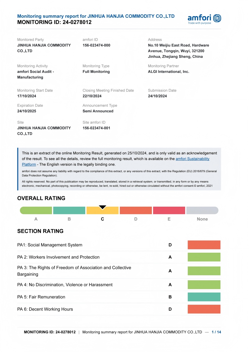 2025 júliusában,Jinhua Hanjia Commodity Co., Ltd.Sikeresen megszerezte a C-szintű tanúsítványt a Nemzetközi Szabványügyi Osztályozási (ICS) gyári könyvvizsgálói programban, amelyet az ENSEIGNE szövetségi szakszervezet által kinevezett harmadik fél európai ellenőrző ügynöksége hajtott végre. Ez a tanúsító rendszer négy szintet foglal magában: A, B, C és D. A Francia Kereskedelmi és Ipari Kamara (FCD) tagjaként a vállalat betartja a Nemzetközi Munkaügyi Szervezet SA8000 standard standardját, a szociális felelősségvállalási ellenőrzéseket a beszállítóira. Az ellenőrzés hatálya alá tartozik a kritikus területeken, ideértve az emberi jogokat, a foglalkozási egészségügyet és a biztonságot, a bélek és a dokumentumok betartását.